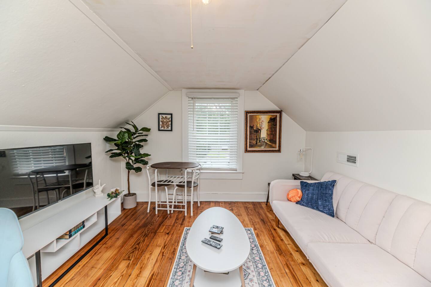 This historic apartment is located in the McIver Historic district of downtown Sanford. It is detached from a beautiful home and tucked quietly in the back at the end of the driveway. It is located above a garage and is two floors. Guests can enjoy their private entrance, and the ample parking this apartment allows. Upon entering you will find the first living room. Furnished with a large comfy couch, and smart TV. There is a small eating space as well. Past the living room is the bedroom. It features a queen sized bed with an open closet and dresser. The downstairs space also has a fully stocked kitchen ready for your stay! Across the hall is the bathroom. The bathroom features a shower with a rain showerhead. Upstairs is a second bedroom with a full size bed, closets and a dresser! Beyond that is the second living room! It also has a comfy couch, smart tv and a eat in dining space! There is a standing desk with chair too.