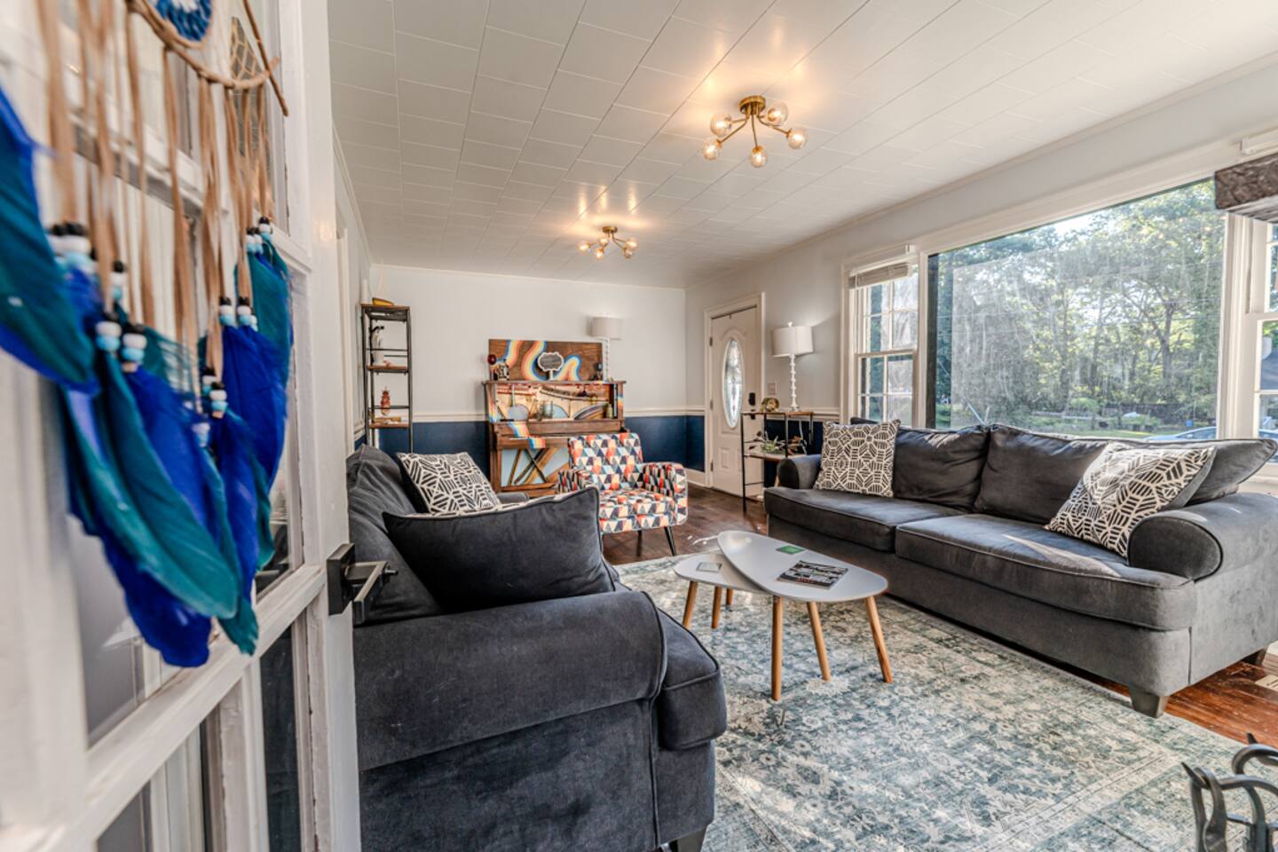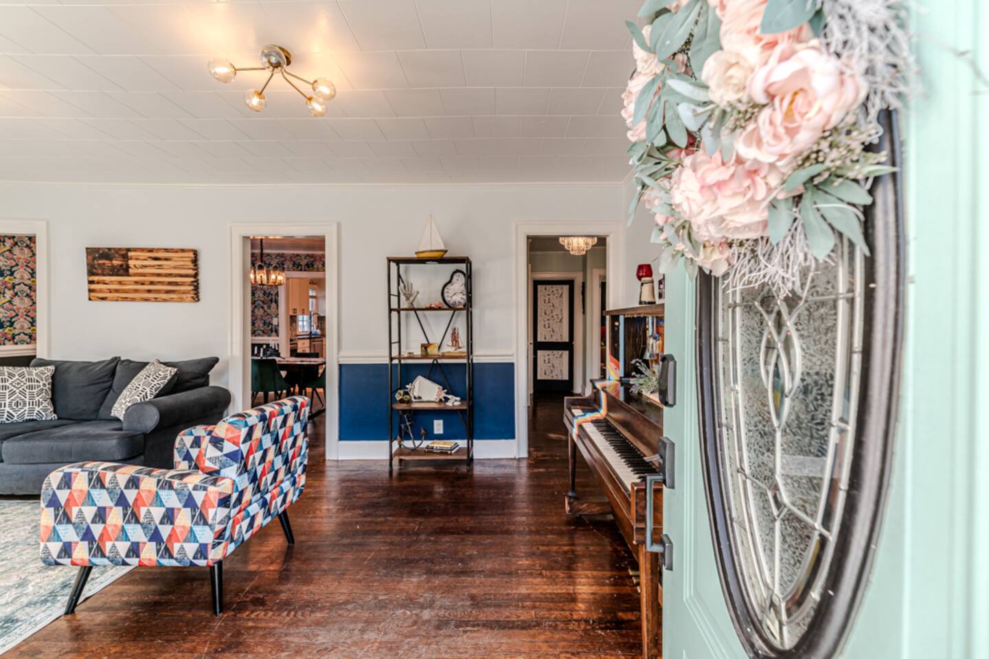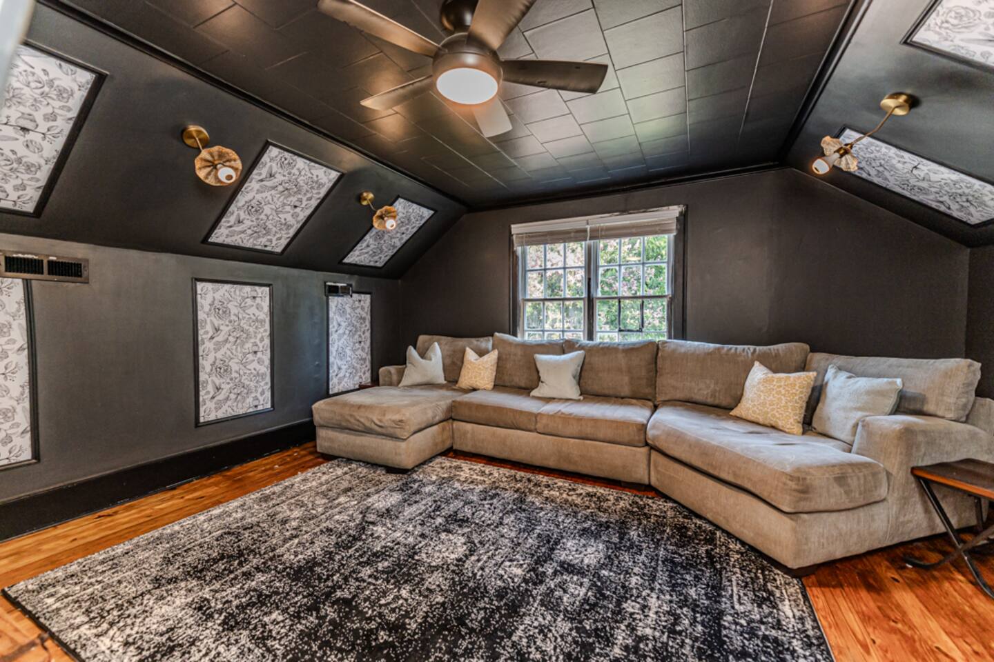 Welcome to the Eclectic Historic Estate! With over 3000 sqft of living space there is plenty to enjoy- from a sprawling living room with large, comfy couches & a custom piano dry bar to the cozy sunroom , and upstairs is a movie room featuring a massive 80-inch smart TV with a surround sound with an old-timey twist ready for cozy movie nights. A 2-min drive to US 1, 30mins to Raleigh or Southern Pines! This home is walking distance to downtown Sanford, a park and walking trails!