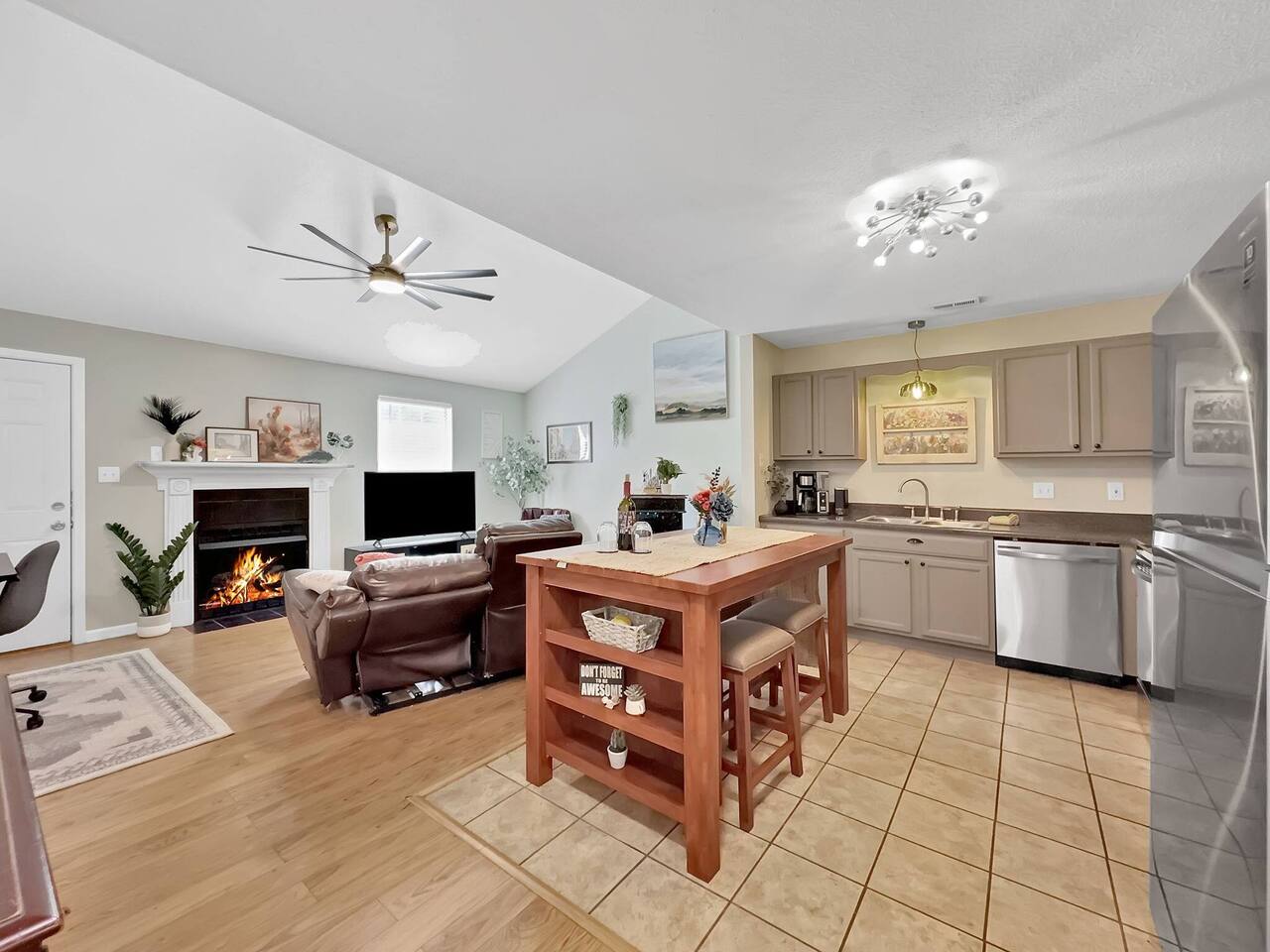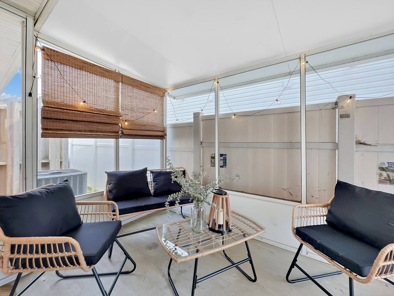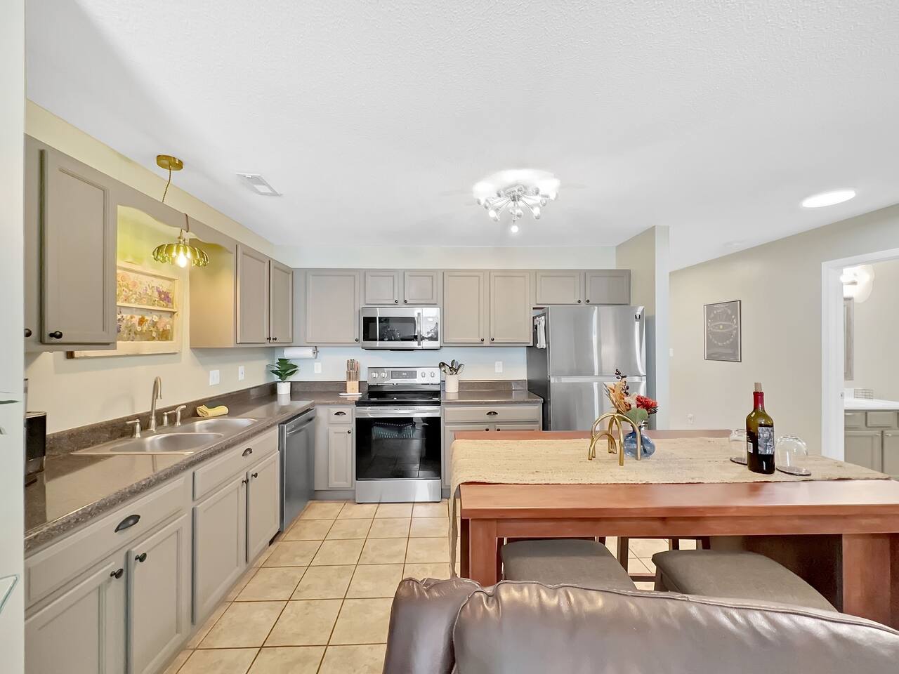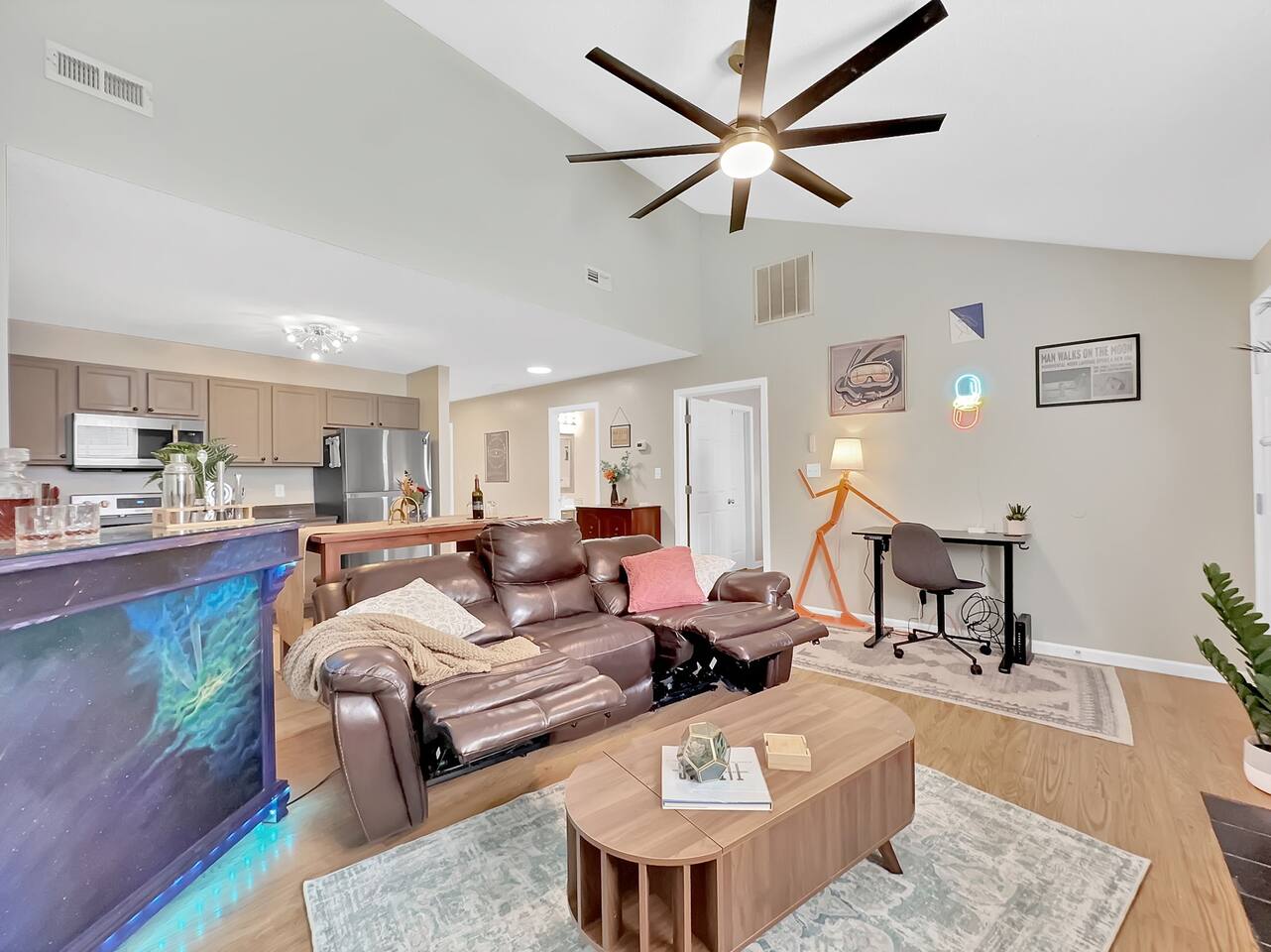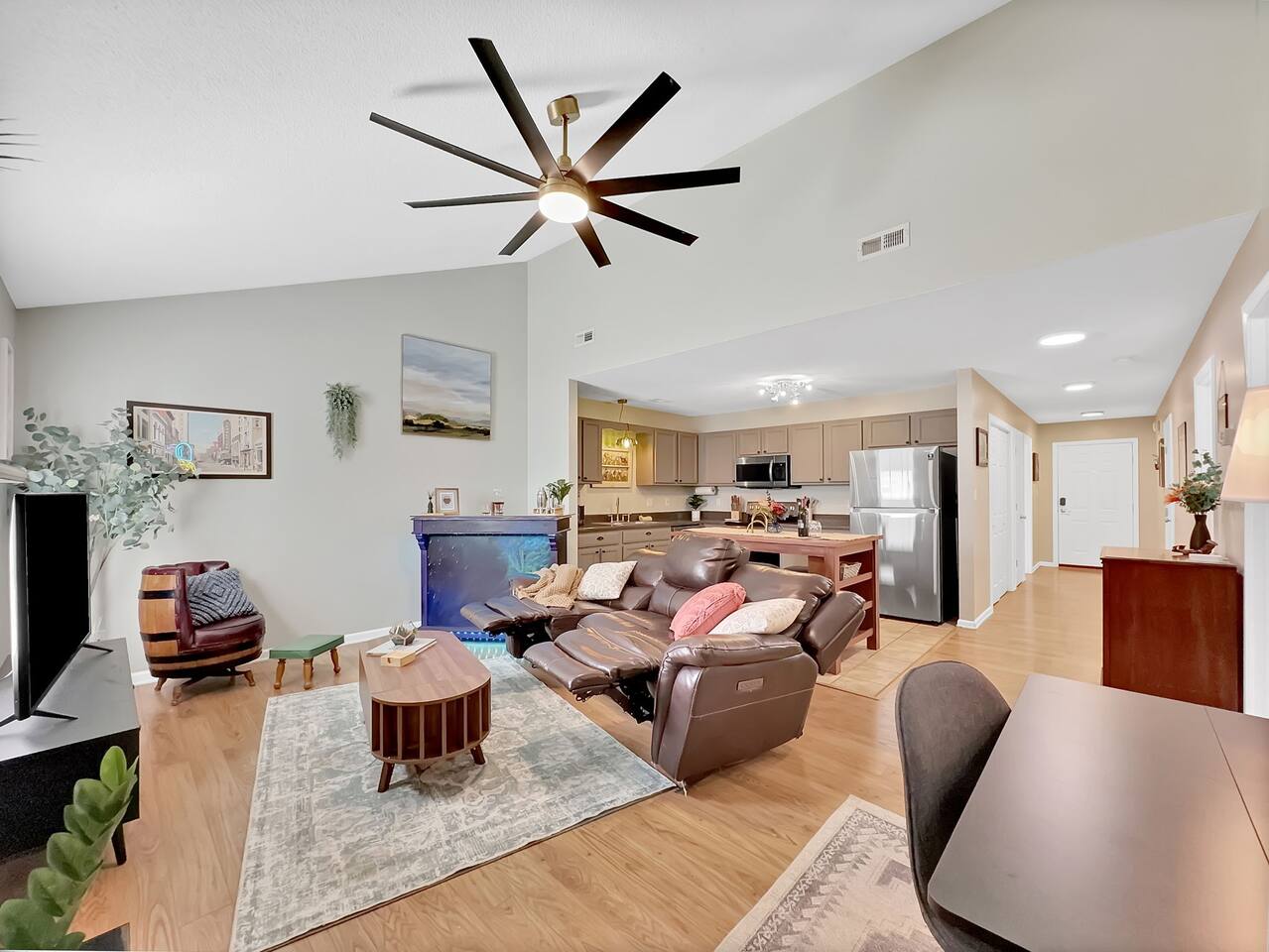 The home has 2 bedrooms and 2 bathrooms. It is fully furnished with everything you could need in the kitchen! Experience the cozy vibes this home offers! All bedrooms feature large closets and room-darkening shades! Both bedrooms have large comfy Queen beds with Smart Tv's in each bedroom. Don't worry about finding a charging block. All nightstands have USB and USBC ports! The living room features a large, cozy, reclining leather couch! Plus, the coffee table pops up for a workstation for those lazy days! The Custom hand-painted bar has LED color lights and a mixology kit with a cocktail book ready for you to begin practicing that martini! The dining room table is large and the stools stow perfectly under leaving ample counterspace and prep space in the kitchen. Need to work while here? Look no further than the dedicated workspace on an electronic standing desk; no matter how you like your desk, this can adjust to the perfect height! Step onto the screened in back porch and you will find a cozy seating area to enjoy the nice weather!